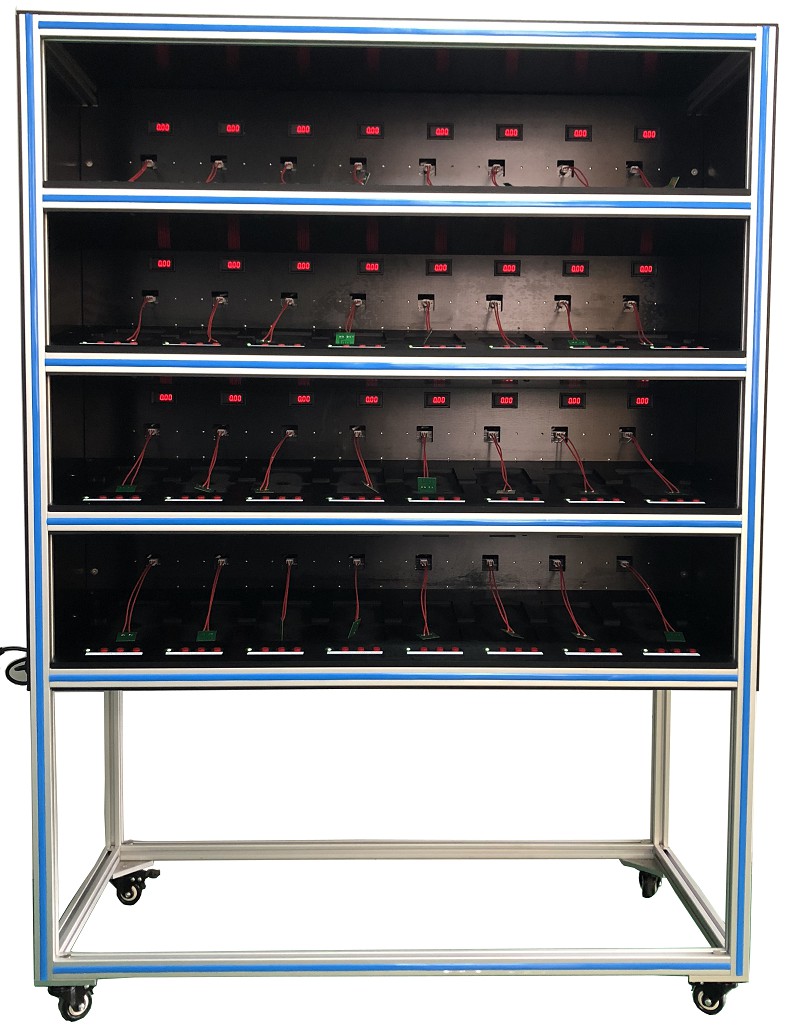 采用電池放電架的安全原理是,將電池內部電量通過一邊采集電壓和溫度的方式,更大限度的將電池電量放盡,以盡可能在降低產品在運輸過程中的任何意外造成的意外災害,保證投資價值。